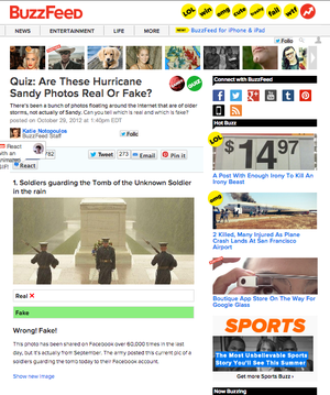 Research by the Indraprastha Institute of Information Technology in Delhi, India and IBM Research Labs analyzed 10,350 fake image Tweets from Hurricane Sandy. Such photos, as the Atlantic’s Alex Madrigal pointed out, generally come in three varieties: photoshopped pictures, falsely-marked old photos resurfaced from previous events and anachronistic, photoshopped images. As photos of Hurricane Sandy flooded the web at a rate of 10 Instagram photos per second, journalists such as Madrigal took on the roles of a “pictoral investigation bureau” to separate legitimate UGC from the deluge of fake images. BuzzFeed, the Guardian and Tom Phillips’ “Is Twitter Wrong?” Tumblr, among others, also monitored fake Sandy images.