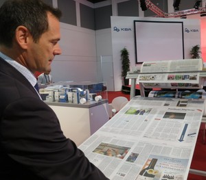 KBA sales director Jochen Schwab shows webs printed on newsprint and other paper qualities on the RotaJet76 press.