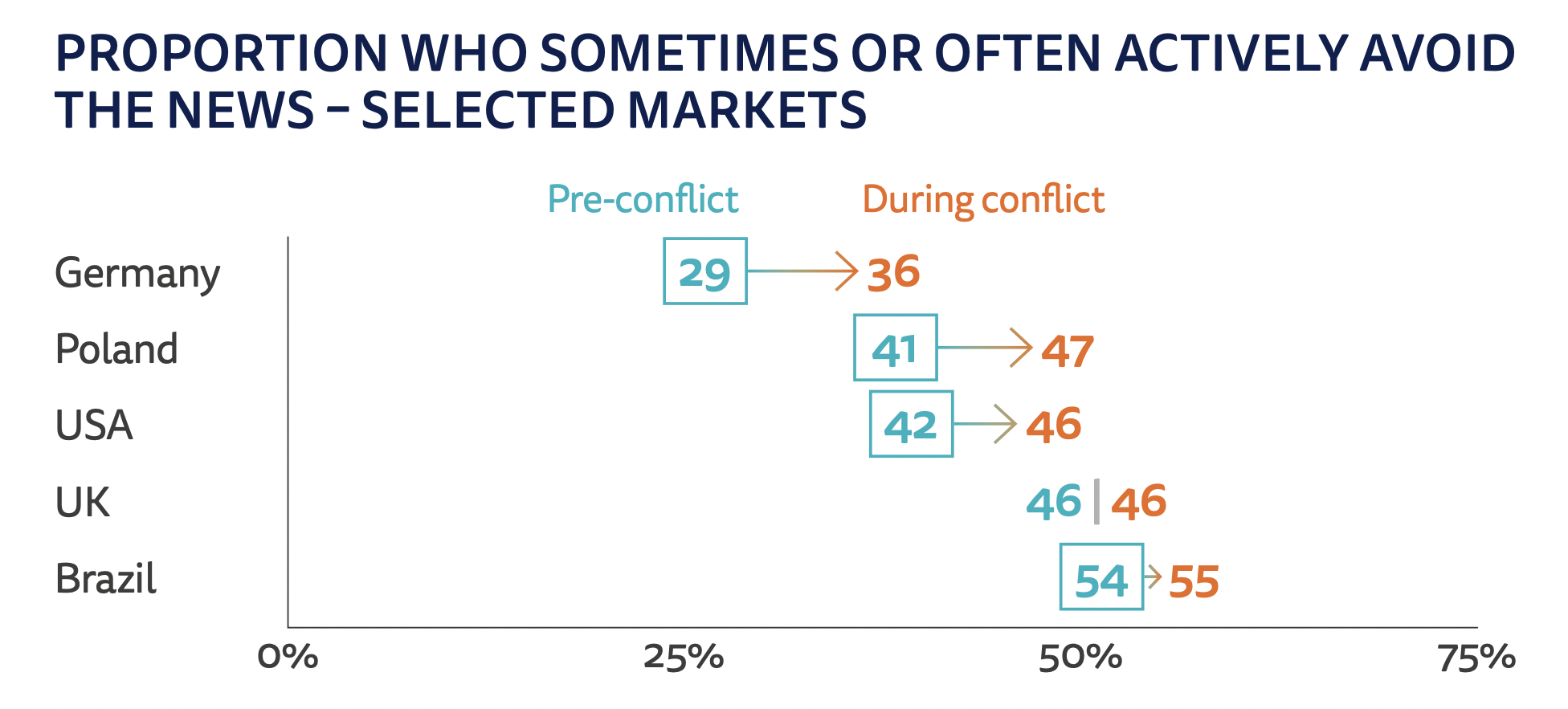 With regard to the earlier finding about news avoidance, the report notes that in some of the surveyed countries the proportion who avoid news has increased since the conflict started.