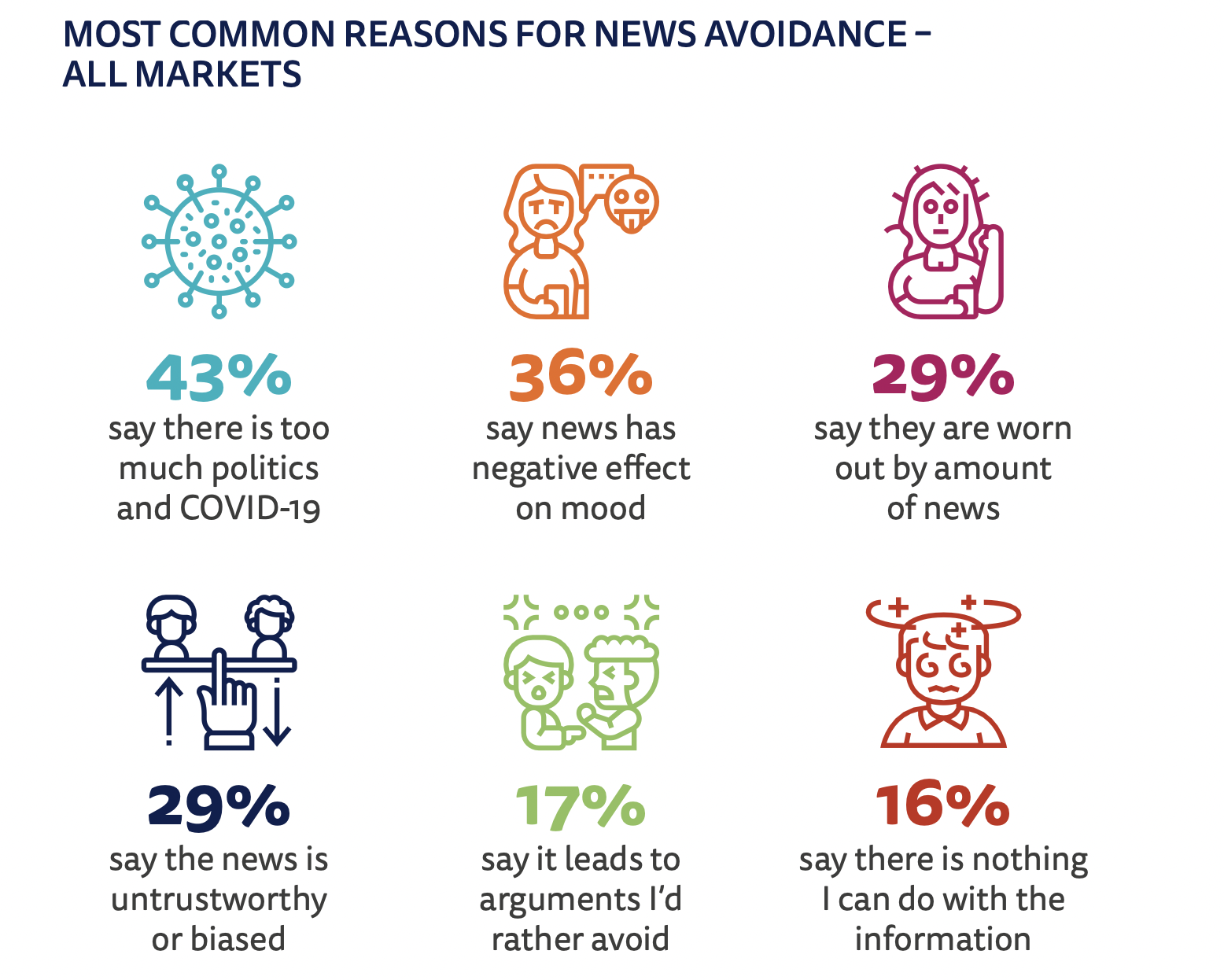 Although the reasons for selective new avoidance vary, some common themes can be observed. Some people say they are put off by the repetitiveness of the news agenda, or report feeling worn out by the news. Many, particularly under 35-year-olds, say that news has a negative effect on their mood, while others avoid the news since they don’t think it can be trusted.