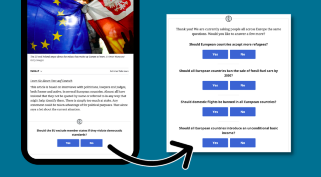 Upon the first scroll through an article, the user is greeted with a “yes or no” question. This redirects them to a longer questionnaire where they are required to answer about eight questions.