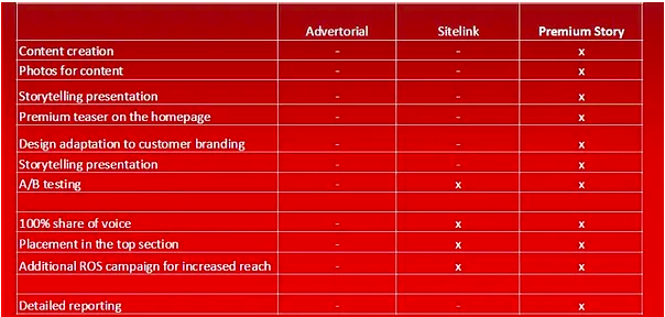 This means it is clear also to the reader that this is advertising. Russmedia includes A/B testing with up to 20 different text and image elements to find out what works the best. The content ads are sold in “all-inclusive” packages. The client has no work to do. Russmedia does it all. Customers that insist on having their own pictures and copy will be refused. Russmedia has a formula and there is no compromise.