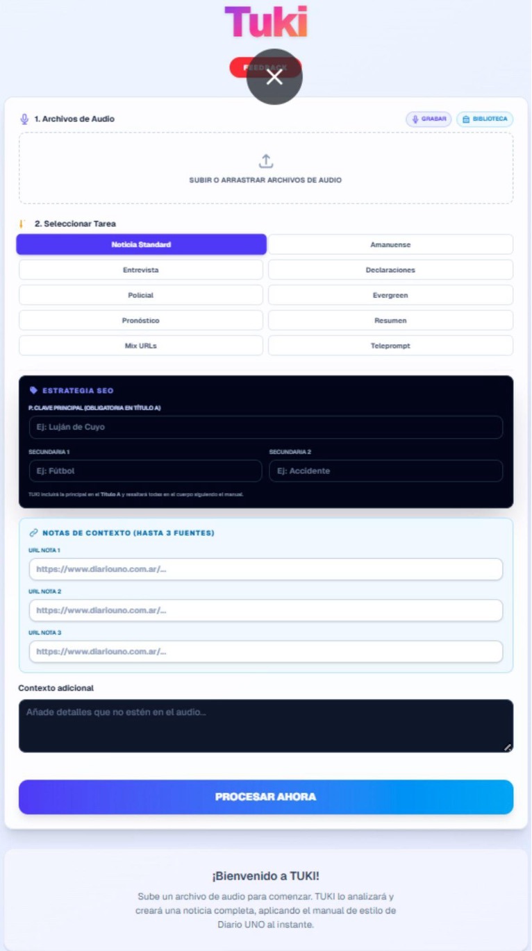 Diario UNO es un medio digital de Mendoza, Argentina, con una vocación innovadora sostenida en el tiempo. Al comenzar a explorar el uso de inteligencia artificial, el equipo identificó dos desafíos claros: el uso individual y desordenado de herramientas de IA dentro de la redacción y la alta carga de tareas de bajo valor agregado, como transcripciones o reescrituras, asumidas por periodistas con amplia experiencia. De esa necesidad surgió Tuki, con el objetivo de ordenar el uso de la IA y liberar tiempo para el periodismo de mayor profundidad.