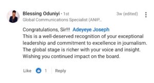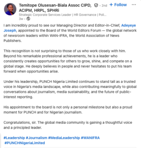 Last month, when it was announced that Adeyeye Joseph had been elected to the Board of WAN-IFRA’s World Editors Forum, the accolades and acknowledgements from colleagues and peers on social media gave a glimpse into a career shaped as much by conviction as by credentials.