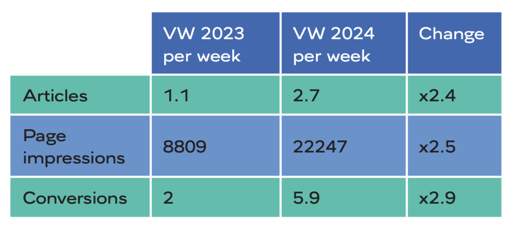 Al observar específicamente a VW, Benjamin analizó los números y el equipo concluyó que sí, había razones para ser optimistas. Había interés de los lectores en noticias relacionadas con la empresa, así como en informes sobre nuevos modelos producidos en la región: tanto el alcance como las conversiones parecían buenos tras una primera revisión a 90 días desde el inicio del contenido para la audiencia. Luego, a partir de finales del verano de 2024, comenzaron a circular malas noticias sobre VW: la empresa estaba en una posición estratégica difícil. Las ventas eran bajas, mientras que los costos se mantenían altos. La compañía, que antes garantizaba a sus empleados buenos salarios y seguridad laboral, estaba teniendo dificultades. Y los empleados también: la gente estaba preocupada por su futuro.